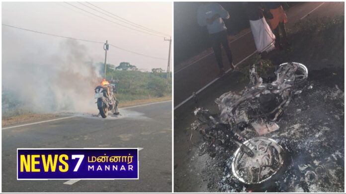 மன்னார் திருக்கேதீஸ்வரத்தில் சிவராத்திரியை அனுஷ்டிப்பதற்கு யாழ் – மன்னார் பிரதான வீதியூடாக மன்னார் திருக்கேதீஸ்வரம் ஆலயம் நோக்கி இன்று மாலை இருவர் மோட்டார் சைக்கிளில் வந்து கொண்டிருந்த போது குறித்த மோட்டார் சைக்கிள் திடீரென தீப்பற்றியது.