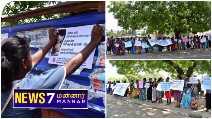 மன்னார் நகர சுற்றுவட்ட பகுதியில் நடைபெற்ற கவனயீர்ப்பு போராட்டத்தில் நூற்றுக்கணக்கான பெண்கள் கலந்து கொண்டு பல்வேறு வாசகங்கள் எழுதப்பட்ட பதாகைகளை ஏந்தியவாறு கவனயீர்ப்பு போராட்டத்தில் கலந்து கொண்டனர்.