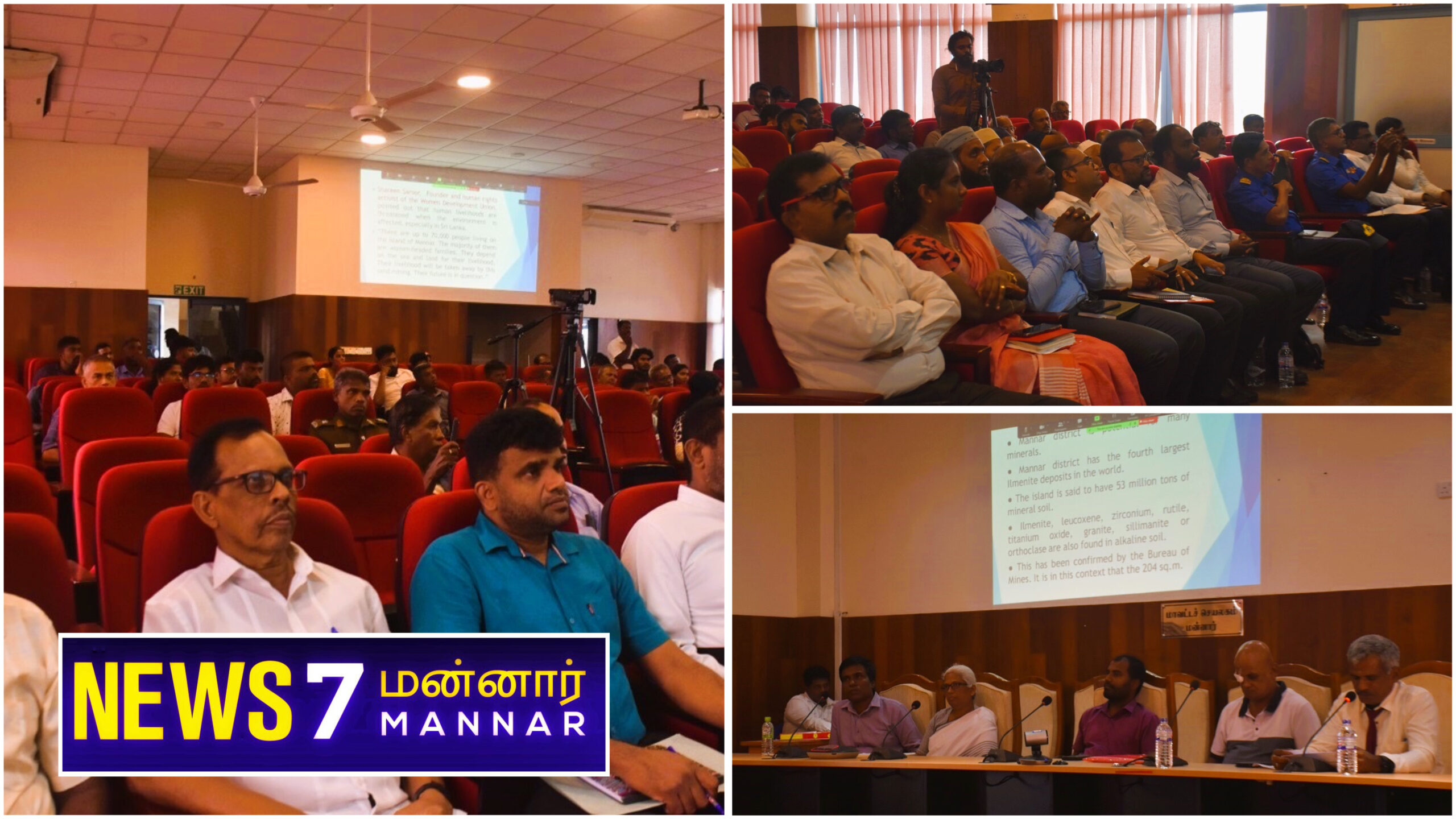 இதன் போது அவுஸ்திரேலியாவை தளமாகக் கொண்டு இயங்கும் டைட்டானியம் சான் லிமிட்டெட் நிறுவனத்தினரால் மேற்கொள்ளப்படவுள்ள கணிய மணல் அகழ்வு தொடர்பாக திட்டம் தொடர்பாக மக்களுக்கு முன் வைக்கப்பட்டது.இதன் போது மன்னாரிற்கு குறித்த திட்டத்தினால் பாரிய பாதிப்புகள் உள்ளமை குறித்து மக்களாலும், பொது அமைப்புகளின் பிரதி நிதிகளினாலும் சுட்டிக்காட்டப்பட்டது.