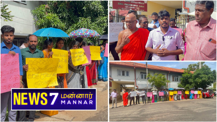 மன்னார் மாவட்ட செயலகத்திற்கு முன்பாக ஆரம்பமான குறித்த ஆர்பாட்ட பேரணியாக வலயக்கல்வி பணிமனைவரை சென்றது.