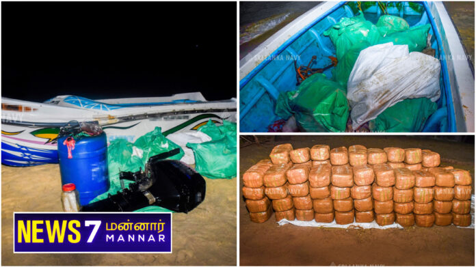 மன்னார், பேசாலை கடற்கரை பிரதேசத்தில் இலங்கை கடற்படை நடத்திய சிறப்பு தேடுதல் நடவடிக்கையின் போது 218 கிலோ, 800 கிராம் கிராம் கேரள கஞ்சா பொதிகளுடன் ஆளில்லாத நிலையில் கண்ணாடி இழை படகு ஒன்று கடற் படையினரால் கைப்பற்றப்பட்டது.