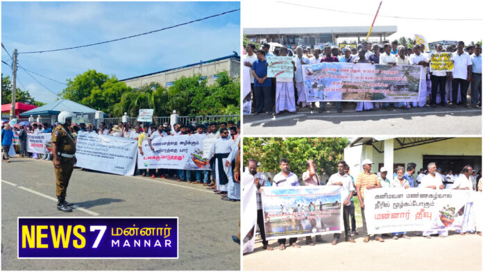 -மன்னாரில் மக்களின் வாழ்வியலை பாதிக்கும் வகையில் முன்னெடுக்கப்பட்டு வரும் காற்றாலை மின் உற்பத்தி மற்றும் கனிய மணல் அகழ்வு ஆகியவற்றுக்கு எதிர்ப்பு தெரிவிக்கும் வகையில் மன்னார் பிரஜைகள் குழு மற்றும் சிவில் பொது அமைப்புக்கள் இணைந்து ஏற்பாடு செய்த மாபெரும் கவனயீர்ப்பு போராட்டம் இன்றைய தினம் புதன்கிழமை(11) காலை 9.30 மணியளவில் மன்னாரில் இடம் பெற்றது.