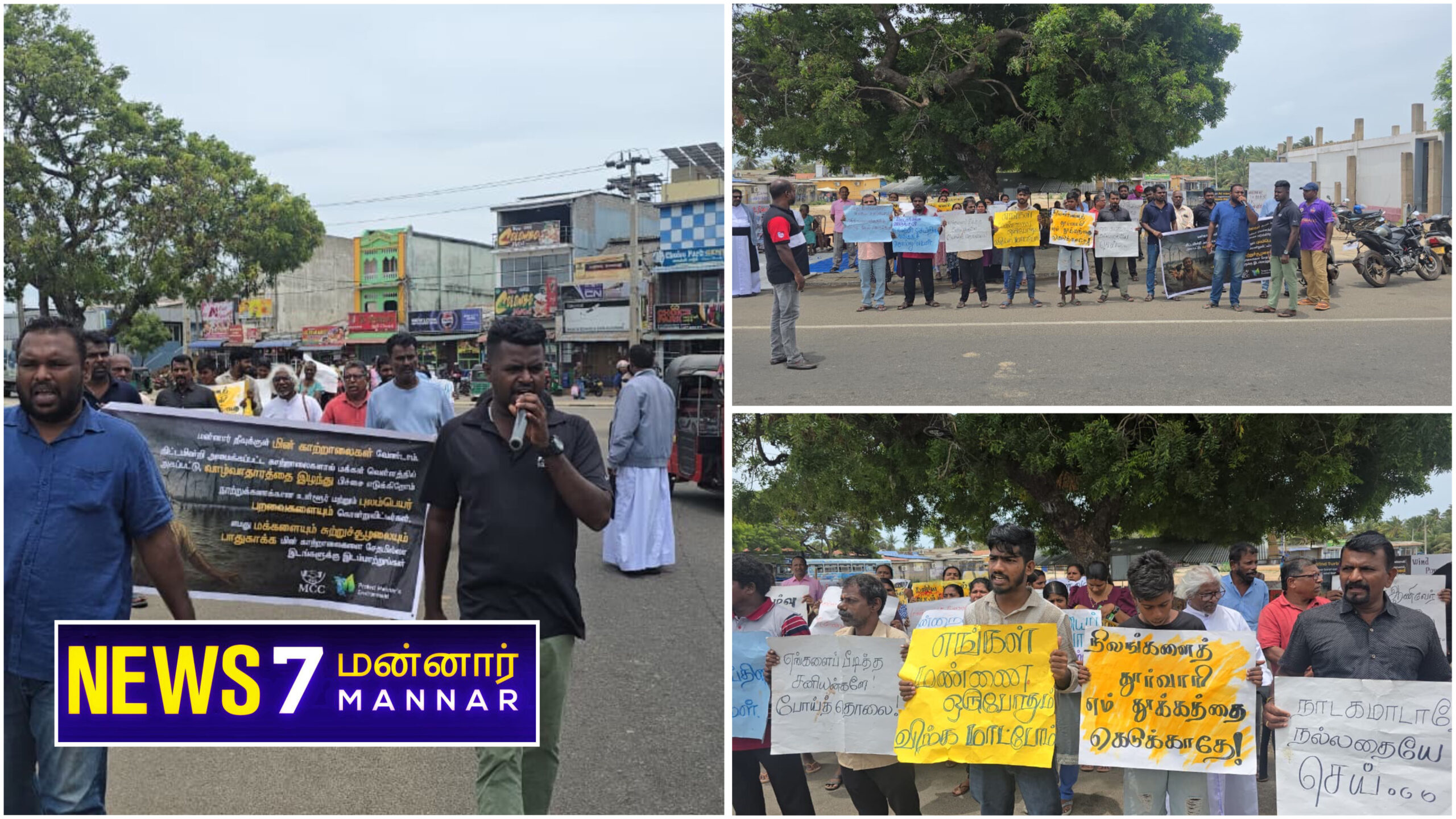 இன்றைய தினம் (18) காலை முதல் முன்னெடுக்கப்பட்டு வருகின்ற குறித்த போராட்டமானது மன்னார் நகர சுற்றுவட்ட பகுதியில் இடம் பெற்று வருகிறது.போராட்டத்தில் ஈடுபட்ட மக்கள் பல்வேறு வாசகங்கள் எழுதப்பட்ட பதாகைகளை ஏந்தியவாறு கோஷங்களை எழுப்பி போராட்டத்தில் ஈடுபட்டு வருகின்றனர்.