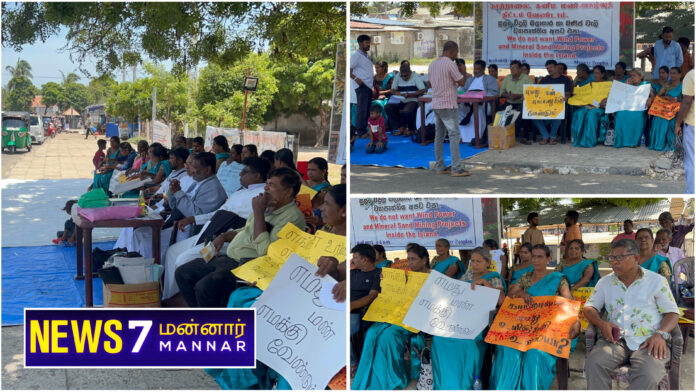 மன்னாரில் புதிதாக முன்னெடுக்கப்படவுள்ள காற்றாலை மின் கோபுரம் அமைத்தல் மற்றும் கனிய மணல் அகழ்வு ஆகியவை முழுமையாக நிறுத்தும் வரை தமது போராட்டம் தொடரும் என போராட்டத்தில் ஈடுபட்டவர்கள் தெரிவித்தனர்.