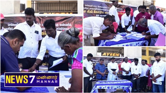 செம்மணி உள்ளடங்களாக இலங்கையில் வடக்கு, கிழக்கு மாகாணங்களில் கண்டு பிடிக்கப்பட்டுள்ள மனித புதைகுழிகளுக்கும், நடைபெற்ற இனப் படுகொலைகளுக்கும் சர்வதேச நீதி கோரி கையெழுத்துப் போராட்டம் தமிழ் தேசிய கட்சிகள் மற்றும் பொது அமைப்புக்களின் ஏற்பாட்டில் இன்றைய தினம் வெள்ளிக்கிழமை (29) காலை மன்னார் நகர பேருந்து தரிப்பிடத்தில் இடம் பெற்றது.